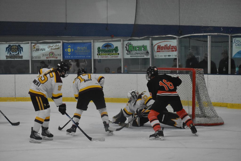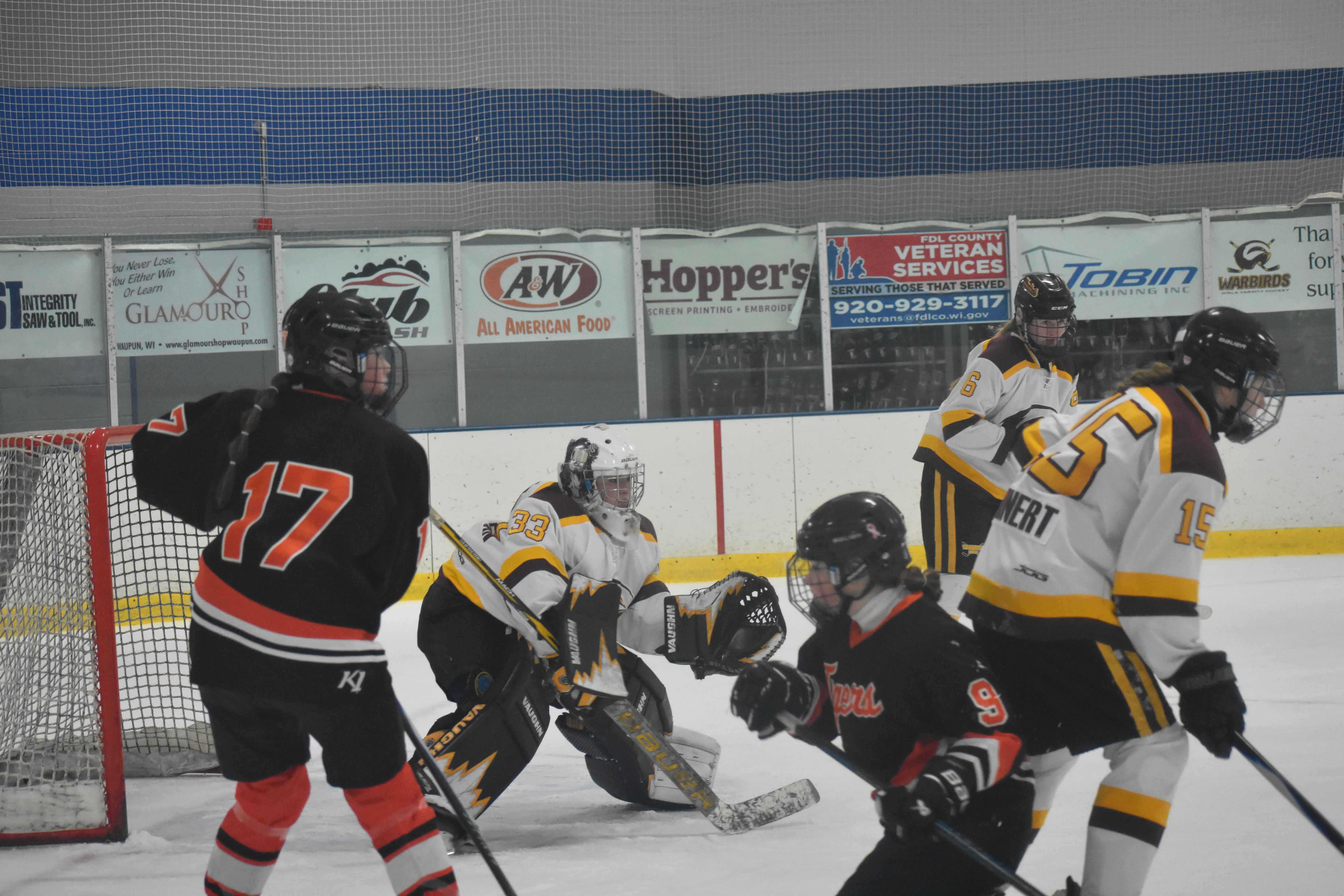 The Black River Falls Tigers knocked on the Fond du Lac door 49 times on Friday night and 48 times they got no answer. Kennedy Kohlman who has established herself as one of the state’s premier goaltenders, acting as the Warbirds doorman, refused all but one puck to enter her net as the Warbirds battled to a 1-1 tie with Tigers.