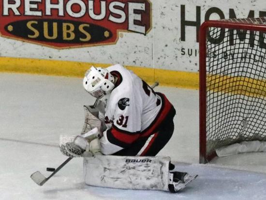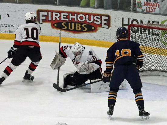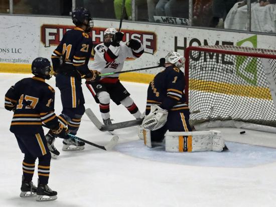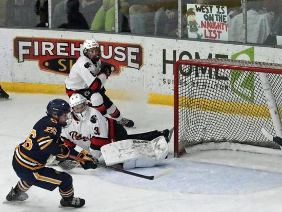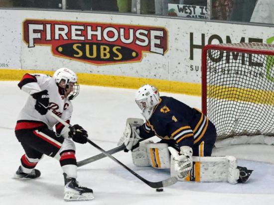 Not everybody was in their seat yet when the Panthers scored their first goal, just 22 seconds in. Grady Miller and Grant Molski got the puck to the net. West goalie Julian Scalcucci made the initial save and one or two more before Miller got a shot past him.