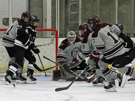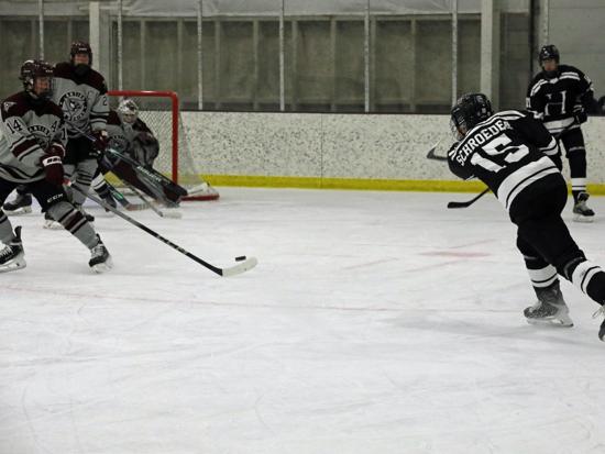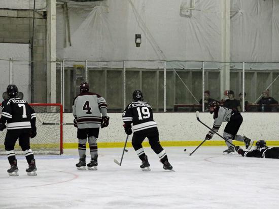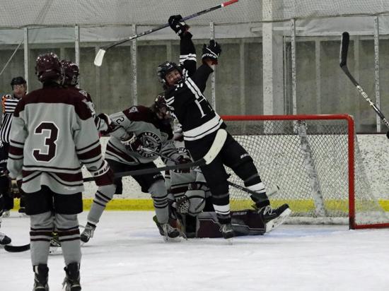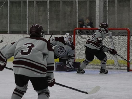 Ethan Novy tied the score at 3:08 in the second when he grabbed a loose puck in the high slot, spun to his right, and roofed a shot over Lyons. With four minutes left in the period, Alex Brittenham gave the Robins the lead when he fired a low shot from the outside hashmarks on the left boards toward the net. Lyons dropped down and extended his stick to stop the puck, But instead, the puck rolled up his stick and over his right shoulder into the top of the netting.