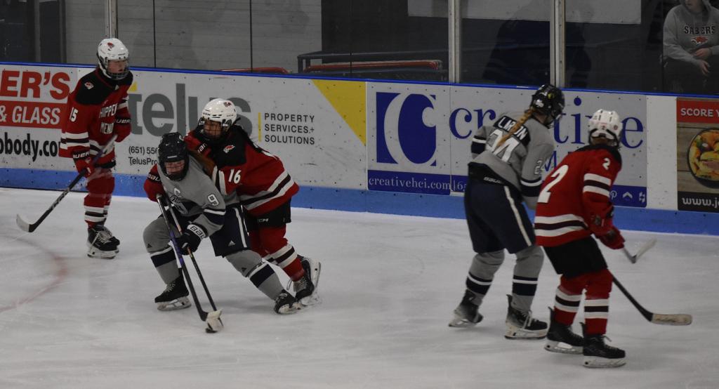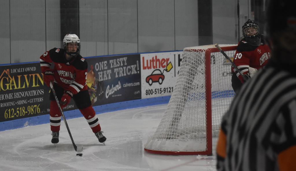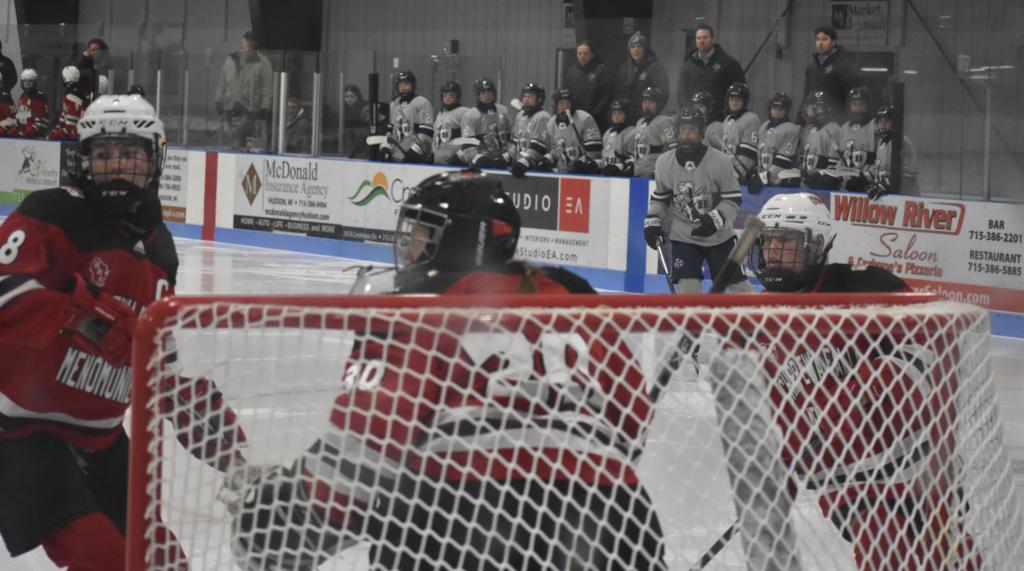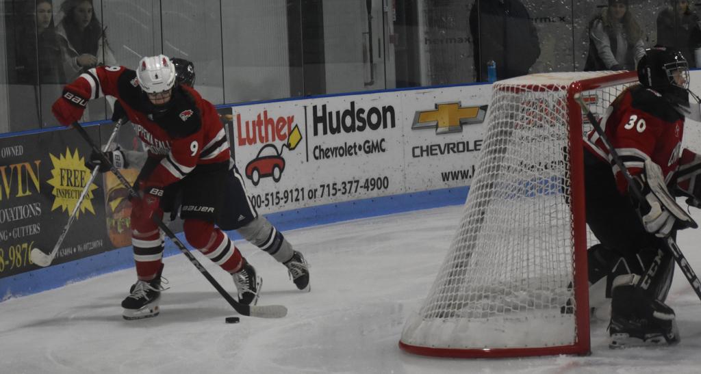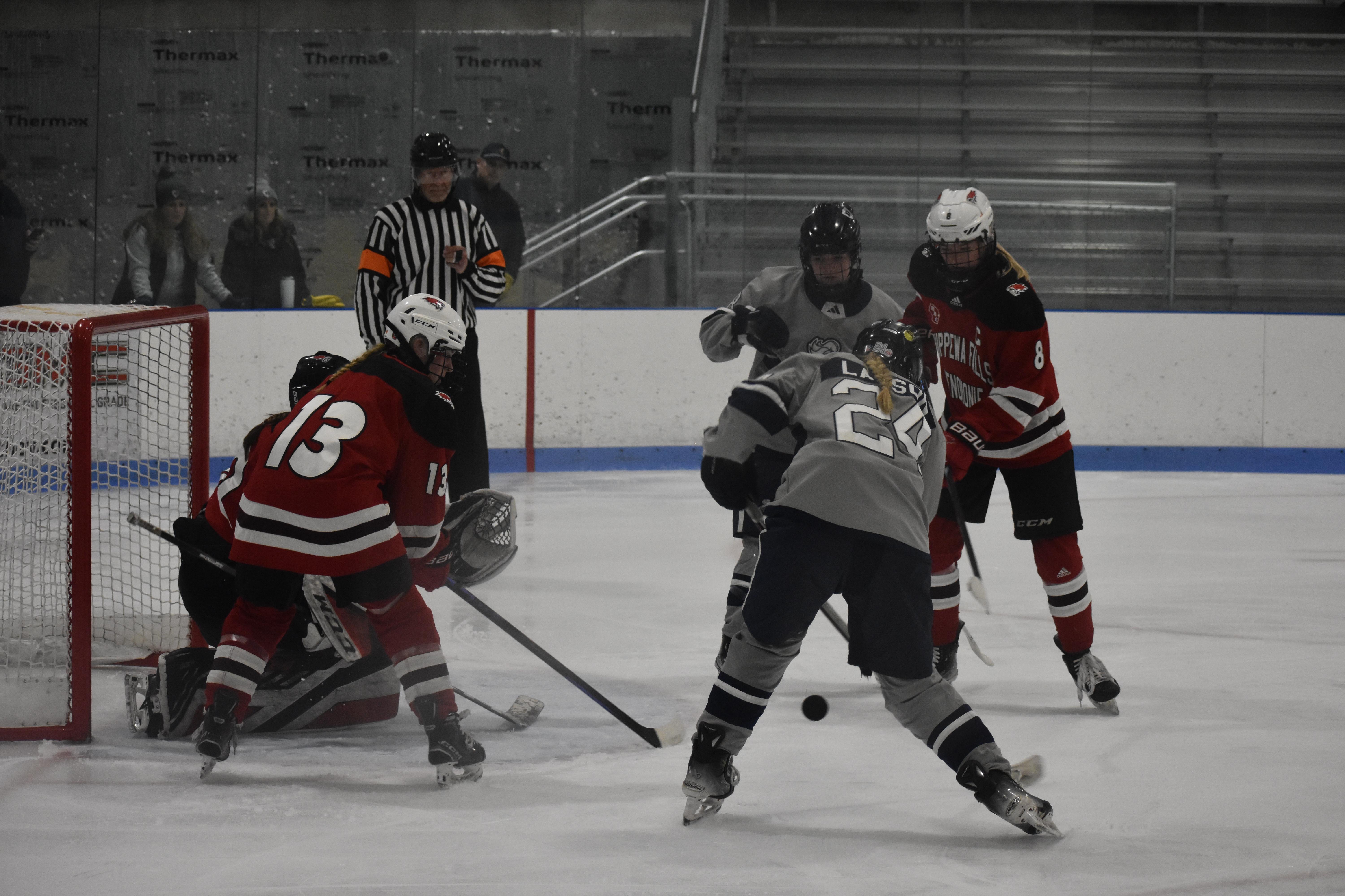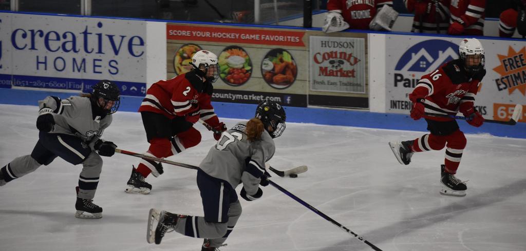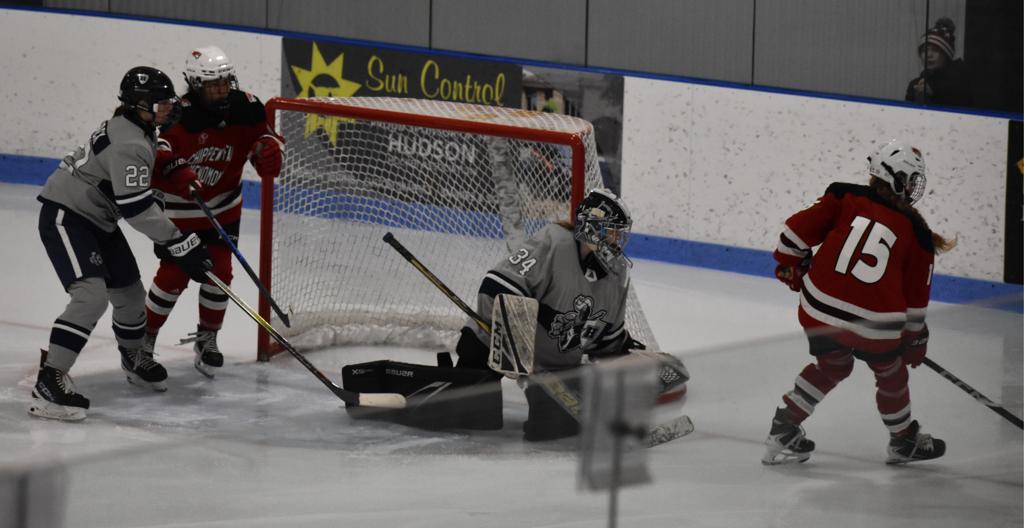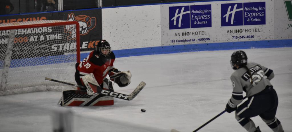 HUDSON, WI—There was a rare and motivational goose-egg shining on the scoreboard in Drewiske Arena at the end of period one Tuesday night in Hudson. And it didn’t sit well with Chippewa Falls/Menomonie head coach Mikayla Hogan who had made shots on goal a point of emphasis in her pre-game speech. “Not sure I’ve been on the wrong side of a goose egg for shots in a period before as a coach or player,” she stated.