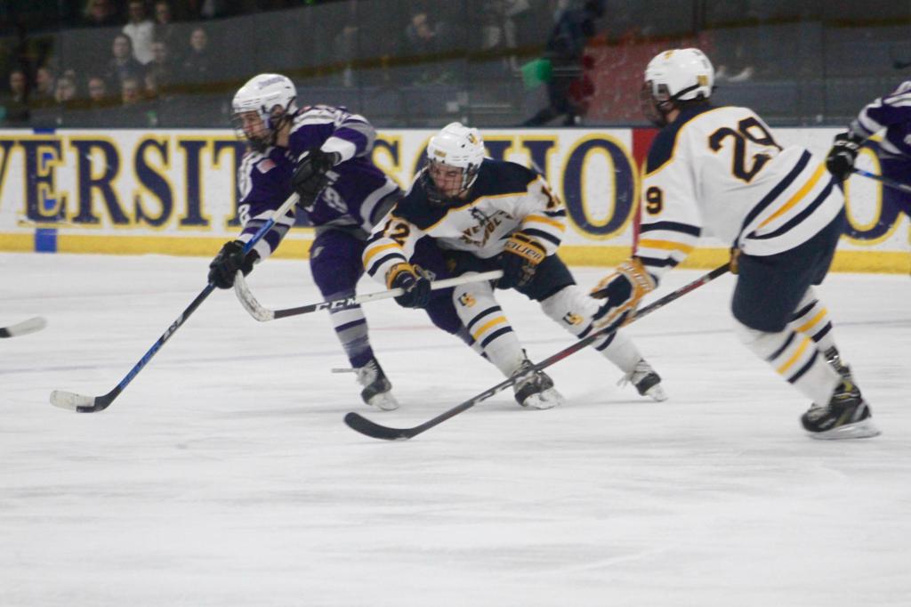 Seconds later, it was 3-0. From the center ice faceoff, the Wildcats moved the puck into the Hilltoppers’ end and forechecked. Peter Ells chased down a loose puck behind the net and tapped it to Carson Mogush in the left corner. Mogush sent it to Herzberg in the low slot and Herzberg swiftly swept it in at 1:39.