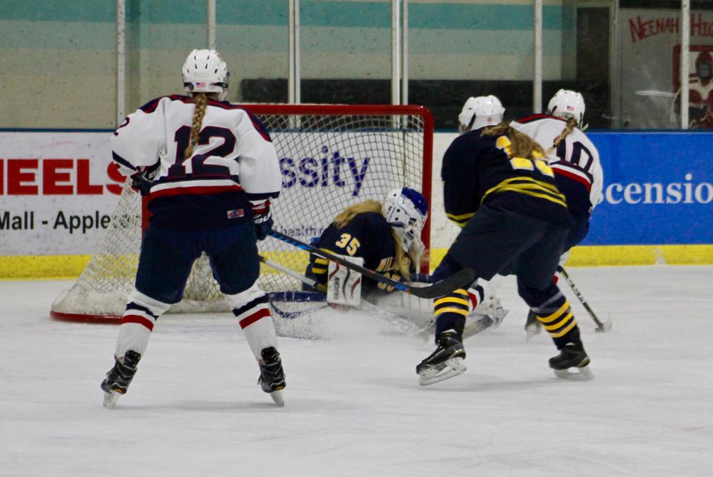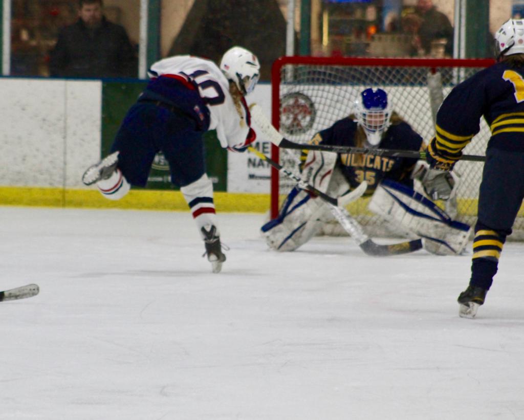 The Wildcats kept the game close by scoring the next goal. Hannah Neudorfer passed the puck to Kinzie Youngblood who was speeding along the left boards in center ice. Youngblood skated it across the Stars’ line. As a defenseman stepped to stop her, Youngblood dropped a pass to Gaby Turer. Turer moved into the slot and fired a shot past Berndt at 4:24.